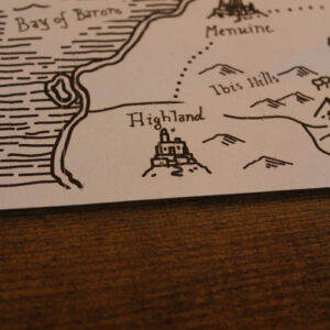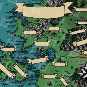 This map is dotted with settlements, each a prime location for a vibrant adventure: a town balanced on a peninsula of steep cliffs, a massive city of monolithic spires and sky-scraping pyramids, a city built in the motherly boughs of an enormous tree, a quaint village with hidden mysteries, and a town in the islands known for it’s vineyards and wine. Forests cling to mountain sides, rivers rush through valleys, and gentle hills roll over the countryside as far as the eye can see.